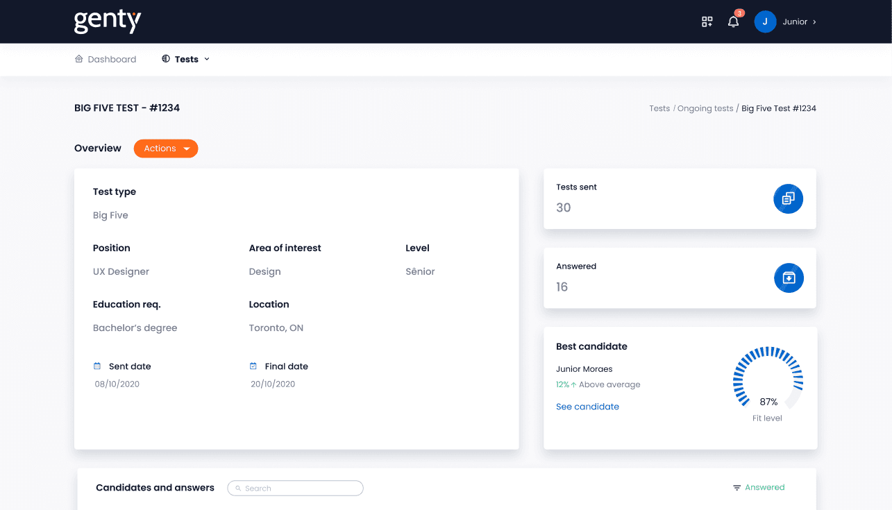 So our challenge was to create the first SaaS in the Brazilian market to help Hiring Managers make data driven decisions, hire top talent faster and give them more control over their process by allowing them to send tests like Big Five, Cultural Fit and DISC to candidates.